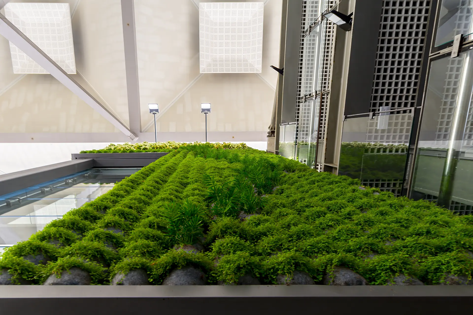 ∙ Zona 1: de entrada del edificio de la Terminal 3 – Salidas, lado tierra. Se cubrirá el muro cortina del acceso con un jardín de altura aproximada de 5 metros y 26,5 m de longitud. La superficie de la actuación será de 132,5 m2.